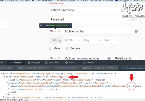 3. در صفحه ای که باز می شود، مشخصات خود را یادداشت و جنسیت خود را وارد کنید. در این مرحله باید روی کد +1 ایالت متحده کلیک راست و گزینه Inspect Element را انتخاب کنید.